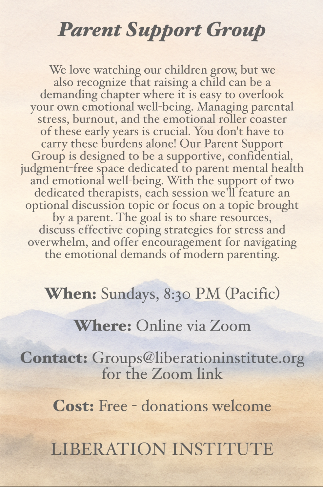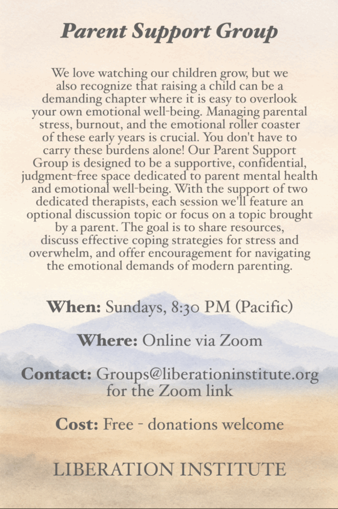 Description: We love watching our children grow, but we also recognize that raising a child can be a demanding chapter where it is easy to overlook your own emotional well-being. Managing parental stress, burnout, and the emotional roller coaster of these early years is crucial. You don’t have to carry these burdens alone! Our Parent Support Group is designed to be a supportive, confidential, judgment-free space dedicated to parent mental health and emotional well-being. With the support of two dedicated therapists, each session will feature an optional discussion topic or focus on a topic brought by a parent. The goal is to share resources, discuss effective coping strategies for stress and overwhelm, and offer encouragement for navigating the emotional demands of modern parenting.